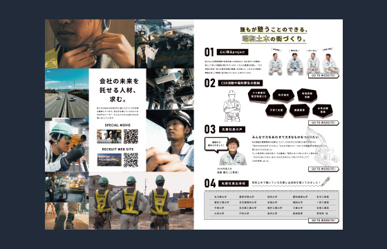 建設業界における同社の信頼感と、地域社会への貢献を明確に伝えることを目的としています。視覚的な訴求力を高めるため、文字情報だけでなく、実際の施工事例や現場の様子を捉えた写真を効果的に配置しています。これにより、同社の技術力と、人々の生活に不可欠なインフラを支えているという企業の社会的な意義を具体的に示しています。