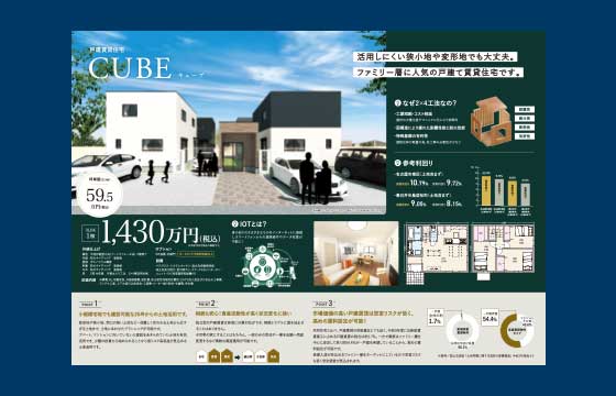 春日井市に拠点を置く協和コーポレーション様の主力商品の一つである住宅「CUBE」の魅力を最大限に引き出すため、商品紹介パンフレットを制作いたしました。物件のコンセプトや仕様といった情報を、ターゲット層に響くよう、シンプルかつ洗練されたデザインで構成しています。専門的な内容をわかりやすく、かつ情緒的に伝えるためのトーン&マナーを確立し、写真選定やコピーライティングにもこだわりました。