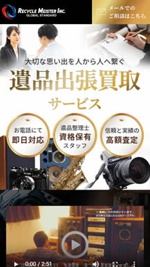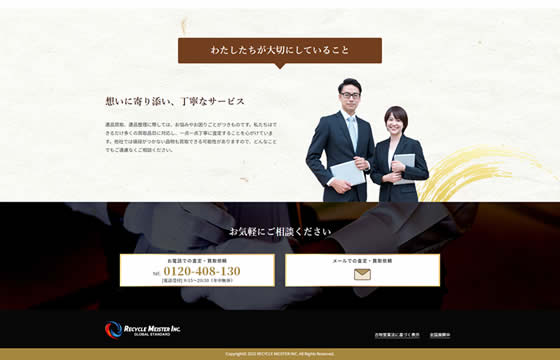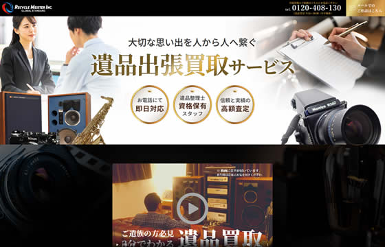 東京都のリサイクル・リユース企業「株式会社リサイクルマイスター」様の遺品出張買取サービス特設サイトを制作させていただきました。遺品を取り扱うということで黒とゴールドを基調に厳かさ・高級感を意識しつつ、サービス内容を分かりやすくデザインしました。